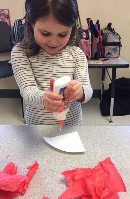 3. Carefully cover all of the glue with pieces of red tissue paper.