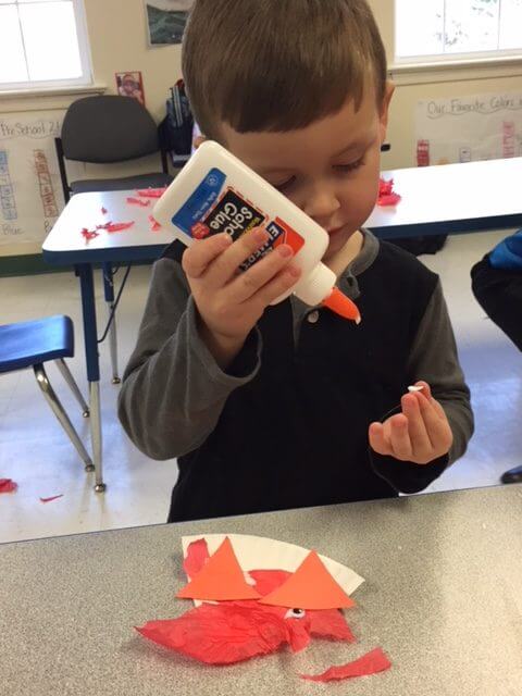 5. Put glue on the back of each eye and place them on top of the tissue paper, beneath the orange ears.